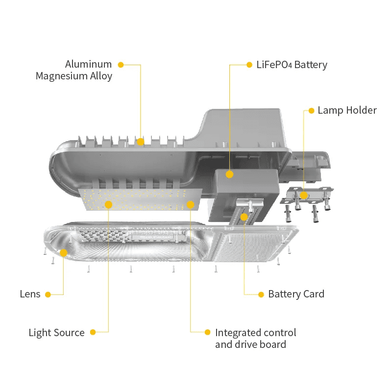 Đèn được thiết kế hợp kim nhôm hiện đại, sang trọng và khả năng chống va đập cao. Pin lưu trữ LiFePO4 với nhiều công nghệ vượt trội hơn các dòng pin thông thường khác, cho tuổi thọ pin dài hơn, hoạt động ổn định và an toàn. Dung lượng pin có thể lưu trữ và sử dụng được từ 2-3 ngày không có ánh nắng.