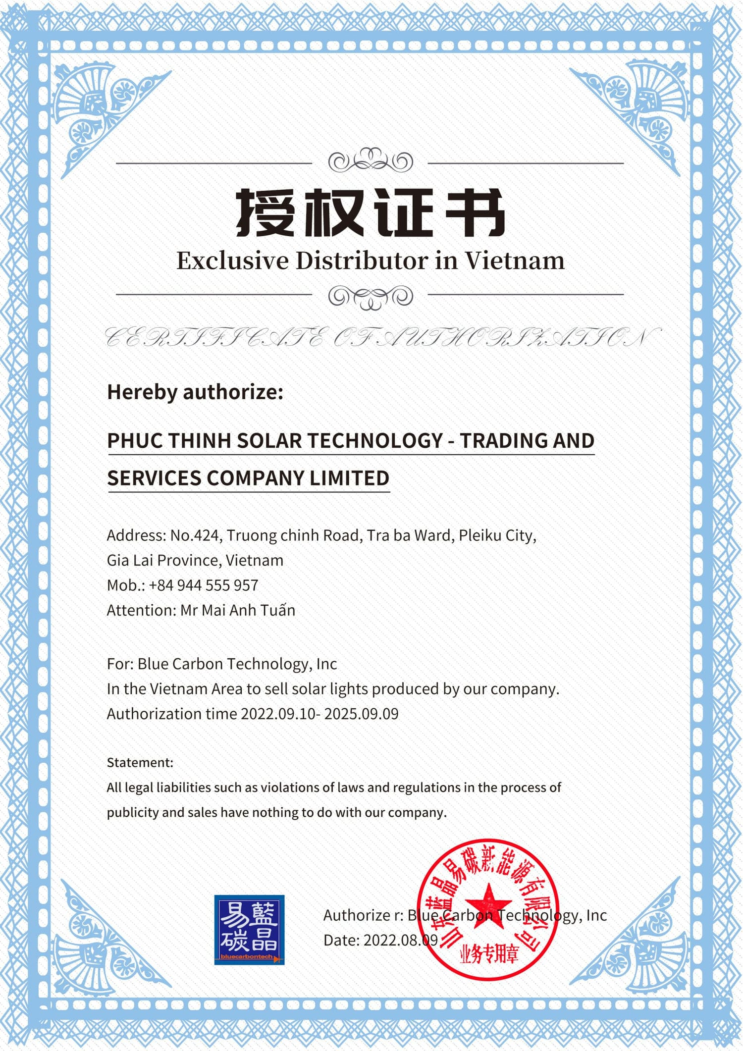 Chứng nhận kinh doanh độc quyền sản phẩm Blue Carbon tại Việt Nam của Phúc Thịnh Solar