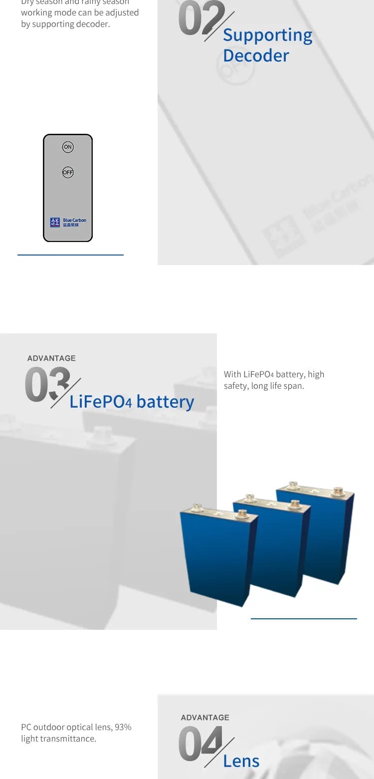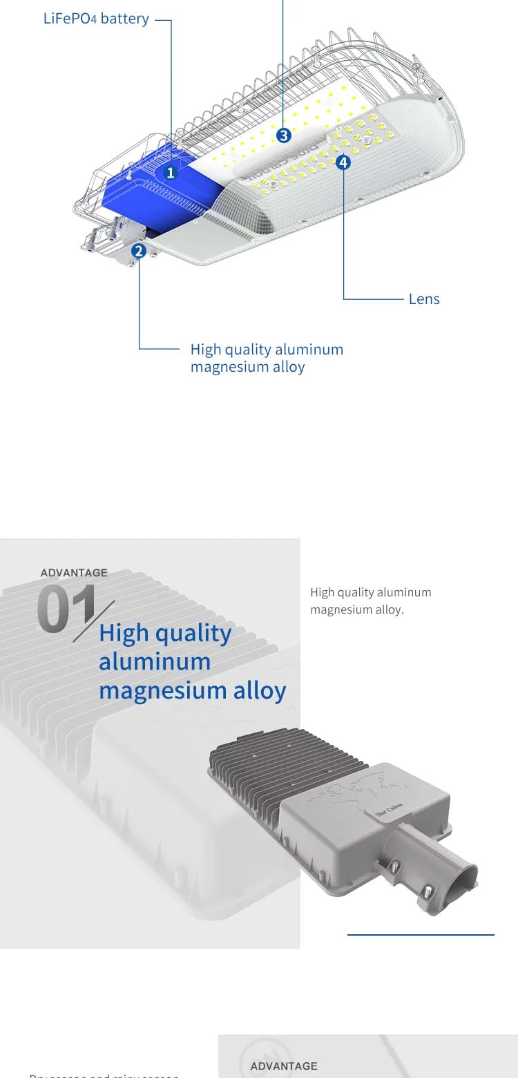 Đèn được thiết kế hợp kim nhôm hiện đại, sang trọng và khả năng chống va đập cao. Pin lưu trữ LiFePO4 với nhiều công nghệ vượt trội hơn các dòng pin thông thường khác, cho tuổi thọ pin dài hơn, hoạt động ổn định và an toàn. Dung lượng pin có thể lưu trữ và sử dụng được từ 2-3 ngày không có ánh nắng.