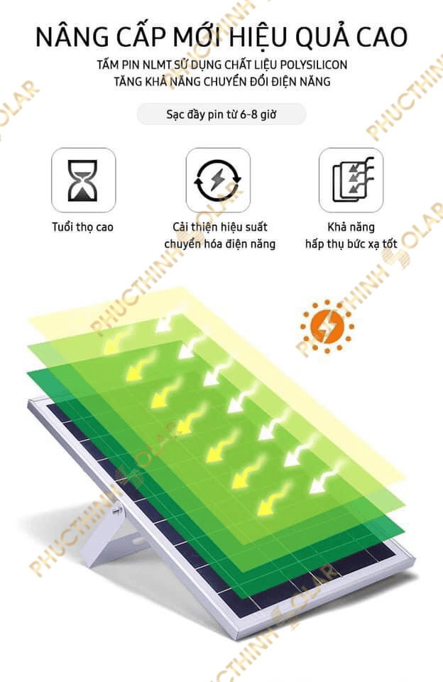 • Công nghệ sạc của tấm pin tiên tiến giúp ổn định dòng điện được sạc vào pin hơn, từ đó hạn chế tối đa khả năng chai pin hay làm ảnh hưởng đến những linh kiện khác bên trong đèn. Việc điều khiển sạc không tốt có thể dẫn đến những hậu quả như nổ pin do dòng điện nạp vào quá công suất, pin nóng lên quá nhanh và không ổn định, hư hỏng các linh kiện như bảng mạch điểu khiển hay chip led của đèn không thể sửa chữa được nữa.