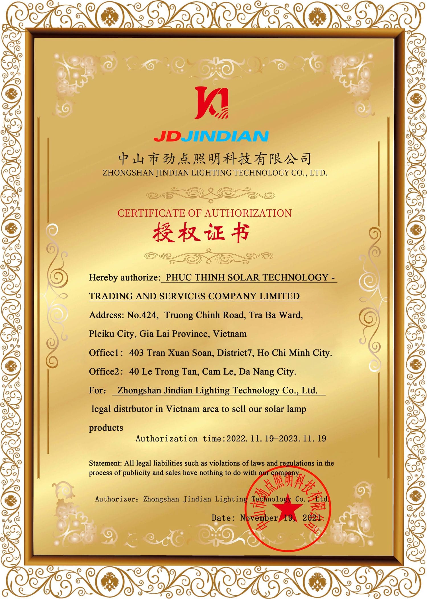 Thương hiệu Jindian thuộc một trong những hãng sản xuất các thiết bị đèn năng lượng mặt trời nổi tiếng nhất hiện nay. Với các sản phẩm chất lượng, đạt tiêu chuẩn Châu Âu, Jindian sẽ mang đến cho khách hàng những trải nghiệm sản phẩm tốt nhất và có tuổi thọ lâu dài, độ bền cao. Ngoài ra, chính sách bảo hành sản phẩm của Phúc Thịnh Solar sẽ giúp khách hàng an tâm hơn khi sử dụng và được hỗ trợ bảo trì các lỗi kỹ thuật trong quá trình sử dụng sản phẩm.