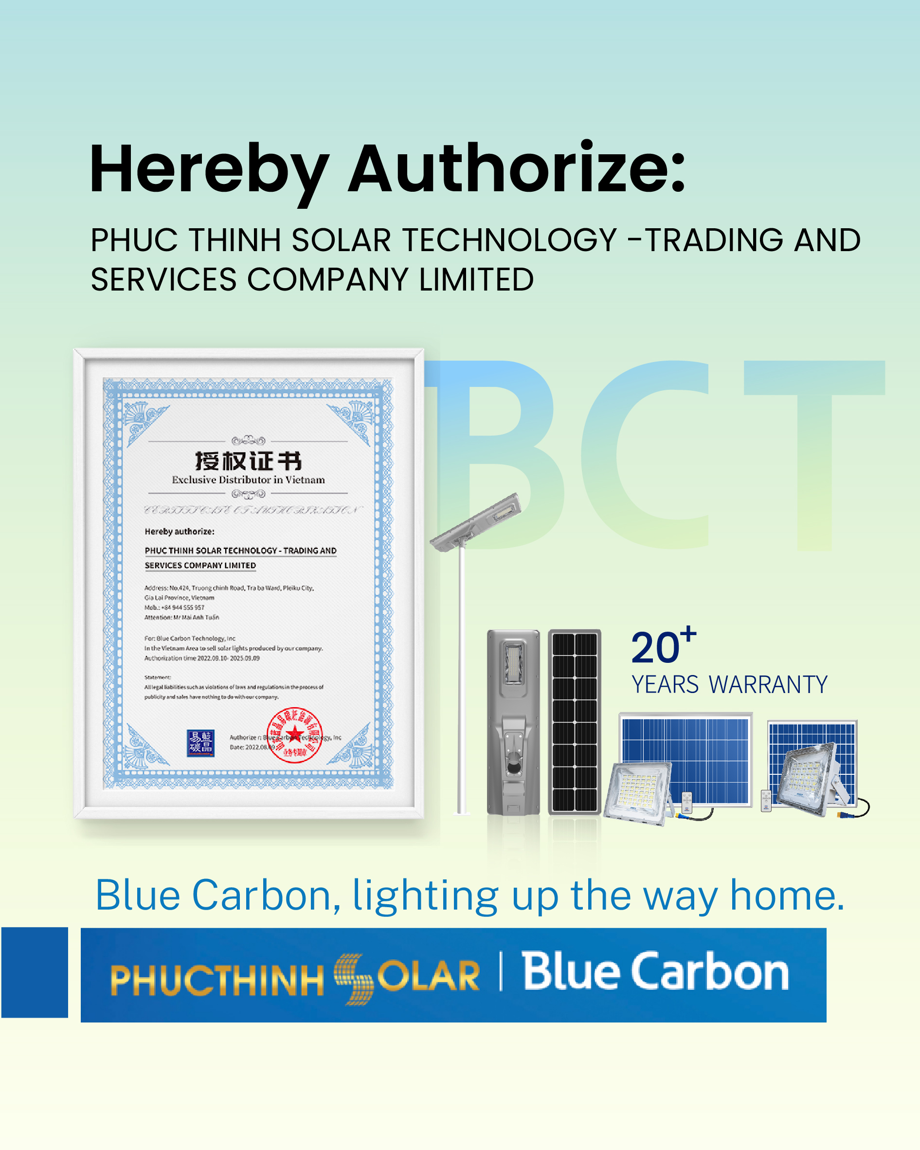 Blue Carbon thông báo “Phúc Thịnh Solar là nhà phân phối sản phẩm đèn năng lượng mặt trời thương hiệu Blue Carbon độc quyền tại Việt Nam.”